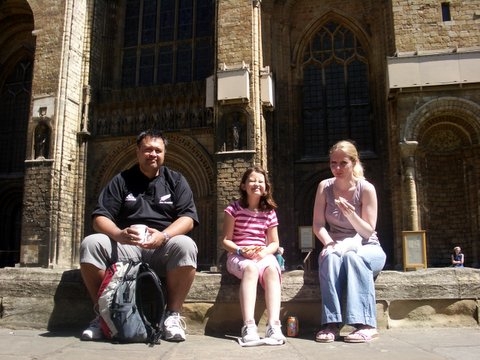| Eimii explaining to Scott the work carried out by Bishop Alexander after the fire of 1141. Scott says Eimii doesn't get her "duck lips" from him! | Sitting outside Lincoln Cathedral and enjoying the sun! |