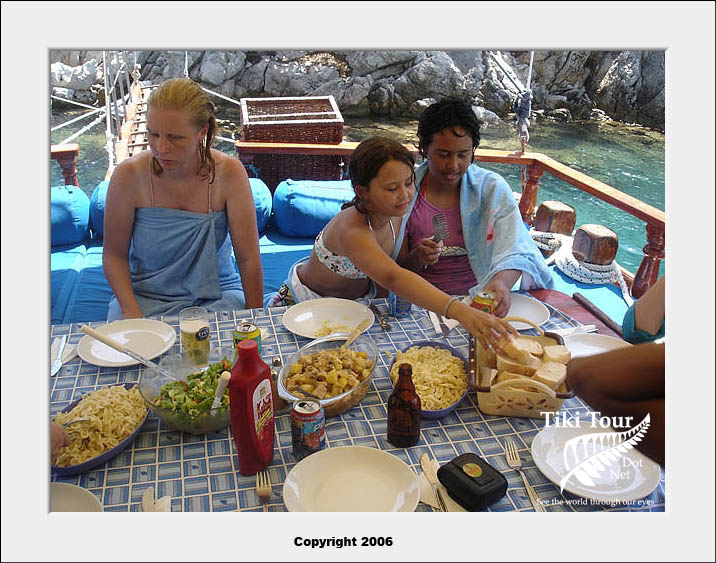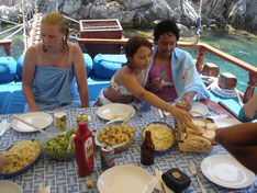 Lunch! This was one of the few times we saw our useless guide. He spent most of the cruise sleeping (must have had a tough night:) |