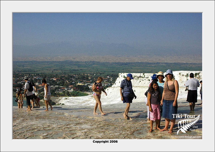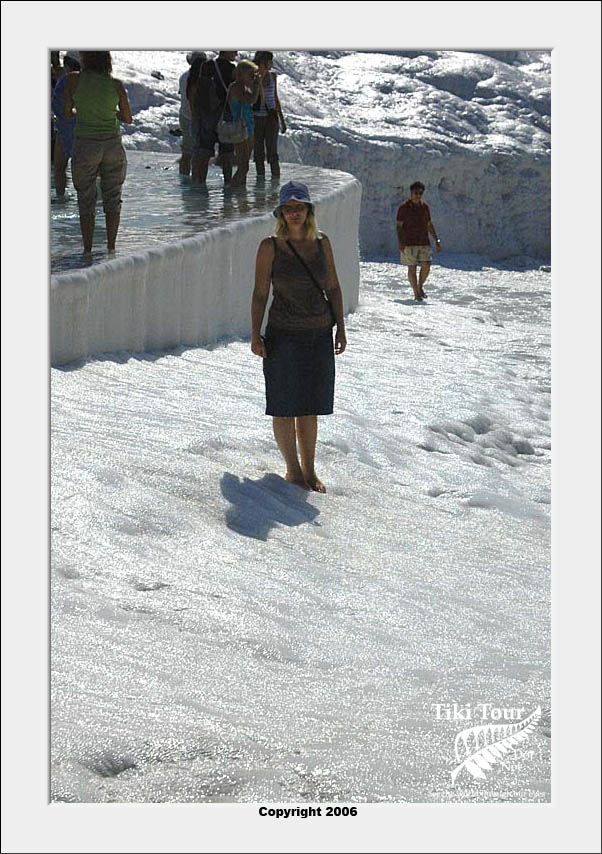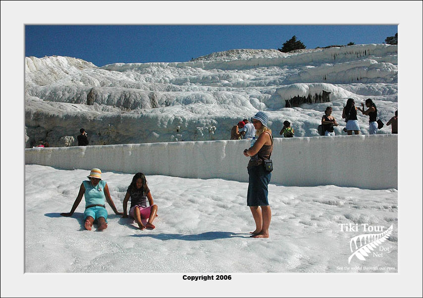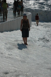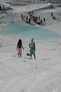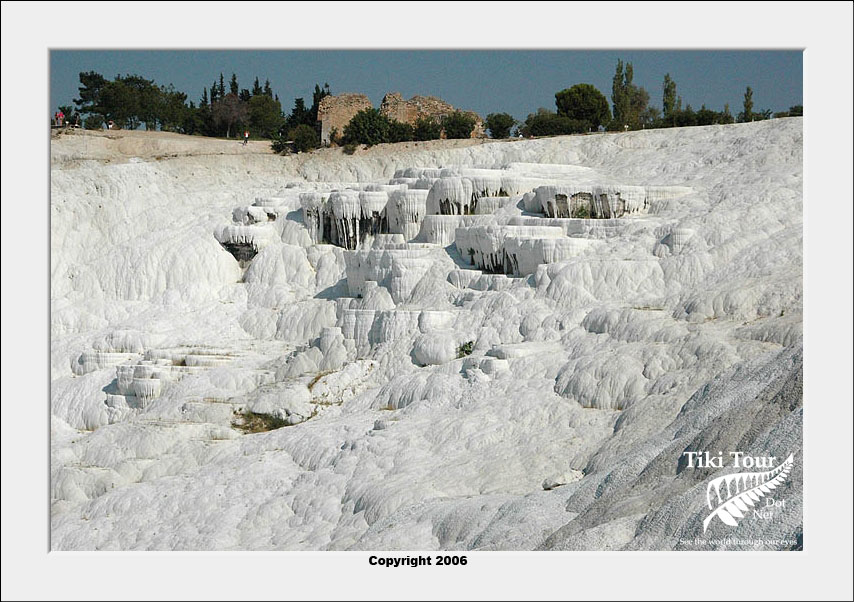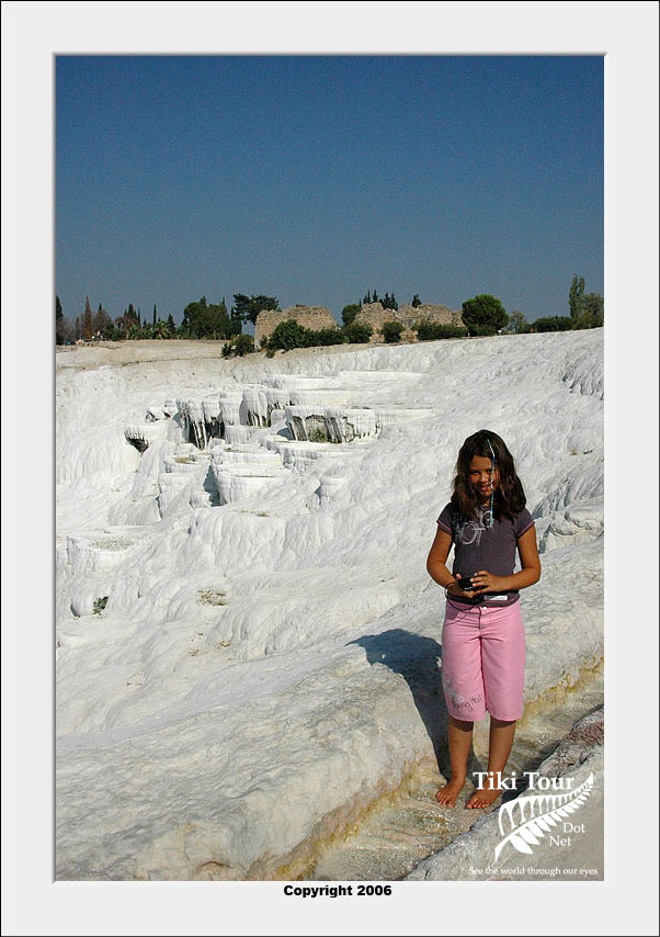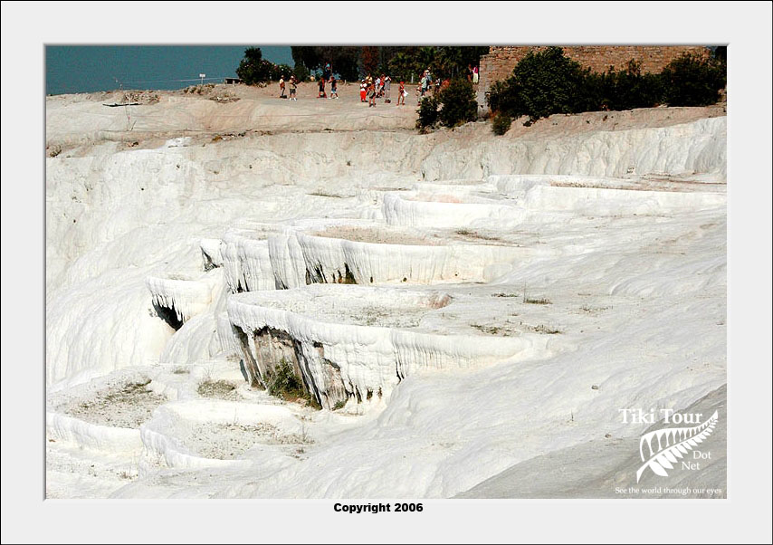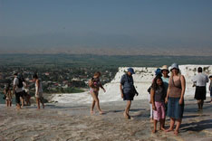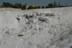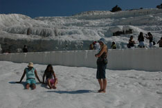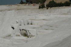 Pamukkale, Turkish for Cotton Castle, is awesome! One of the few places in the world where calcium deposits on such a massive scale still exists. Tourism hasn't been kind to Pamukkale though. Before Pamukkale became a World Heritage site hotels were built at the top and the calcium laden water was diverted to fill swimming pools. However once it became a World Heritage site the hotels were pulled down and now water is managed in a much better fashion (water flows down one side in the morning and the other in the afternoon). |