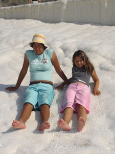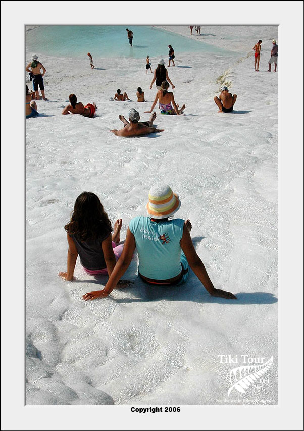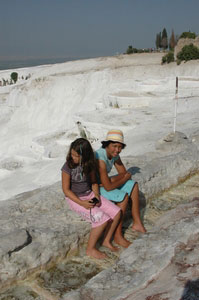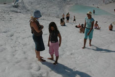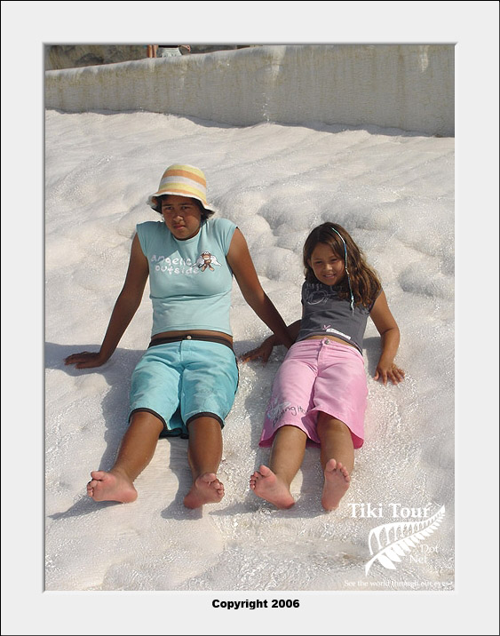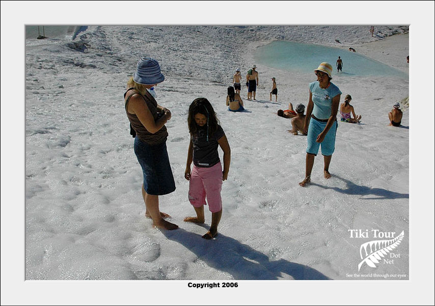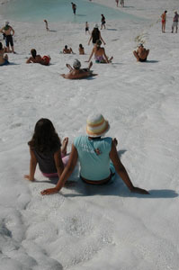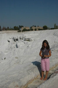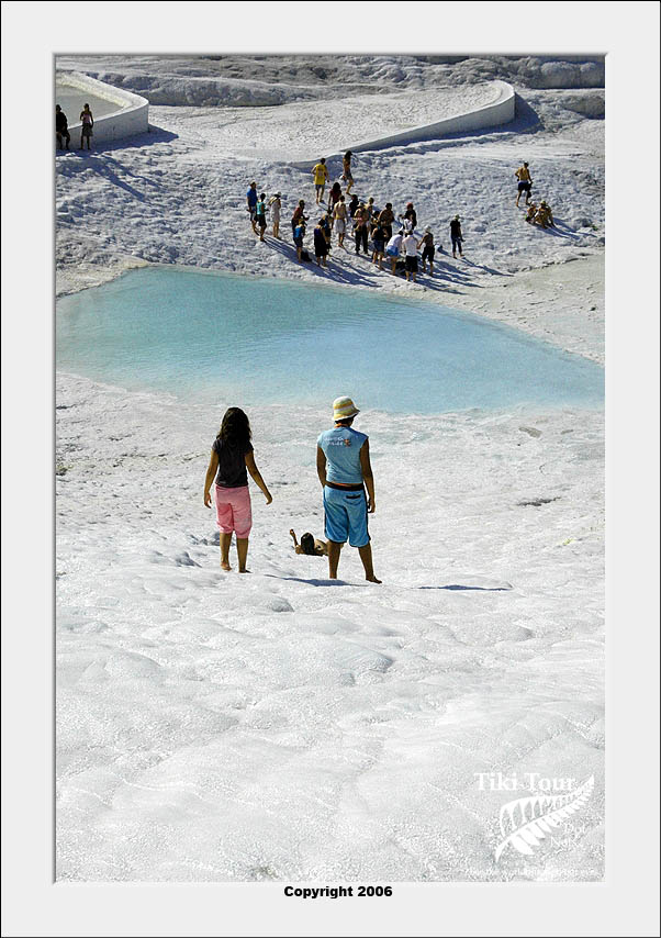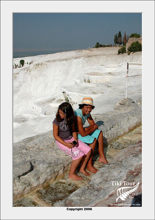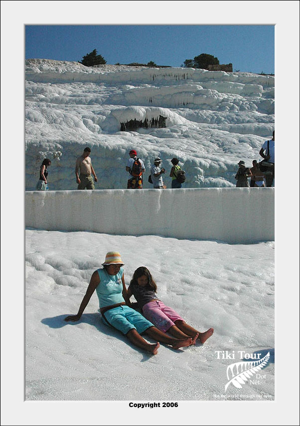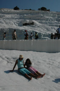 Pamukkale, Turkish for Cotton Castle, is awesome! One of the few places in the world where calcium deposits on such a massive scale still exists. Tourism hasn't been kind to Pamukkale though. Before Pamukkale became a World Heritage site hotels were built at the top and the calcium laden water was diverted to fill swimming pools. However once it became a World Heritage site the hotels were pulled down and now water is managed in a much better fashion (water flows down one side in the morning and the other in the afternoon). |