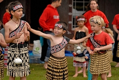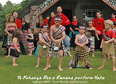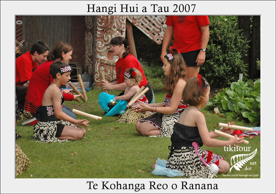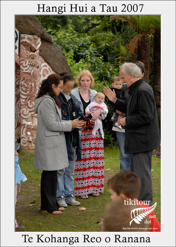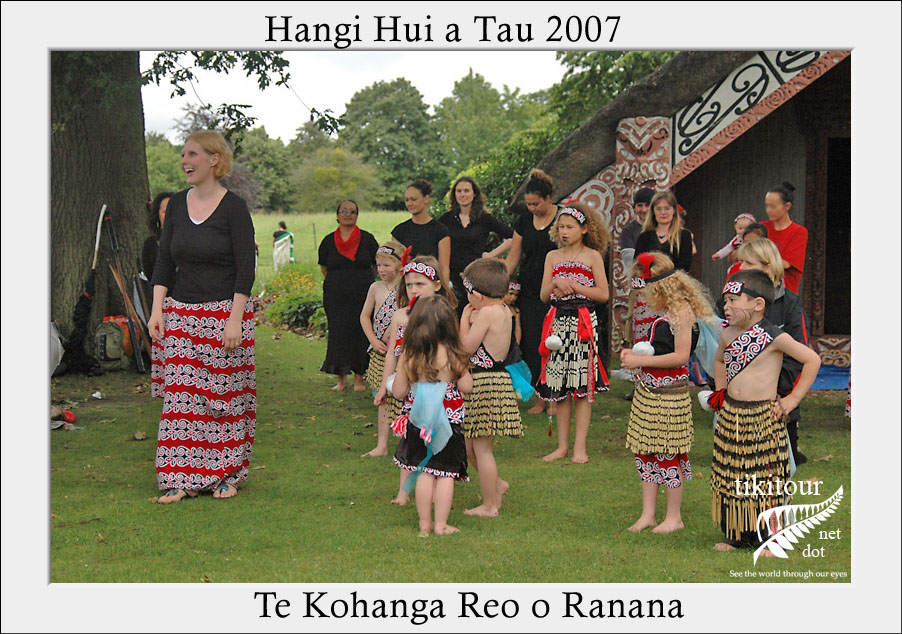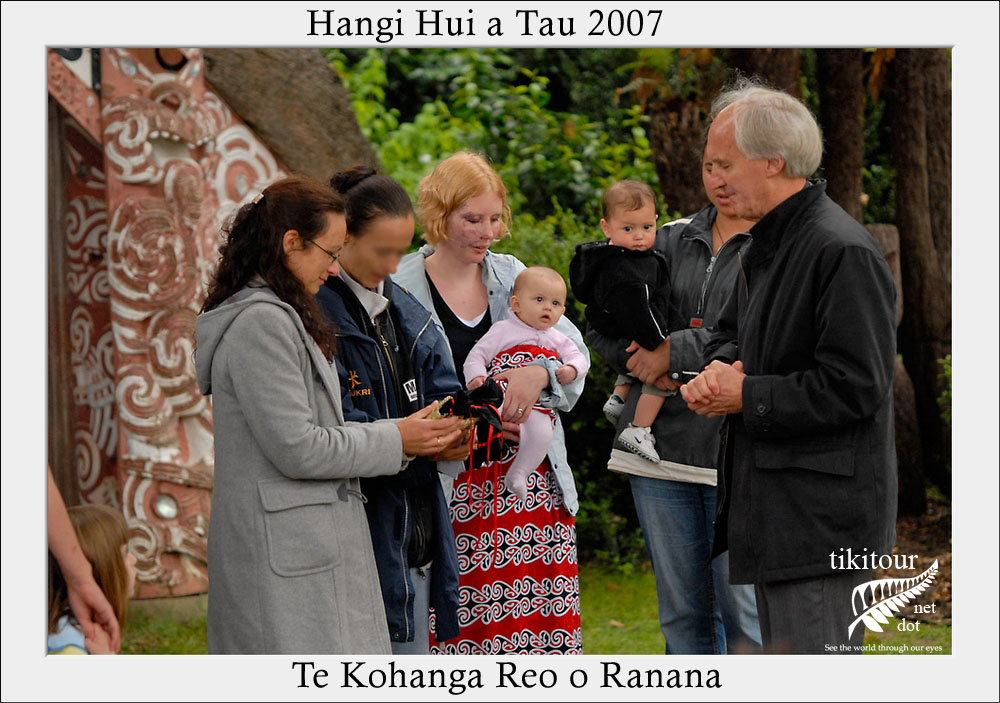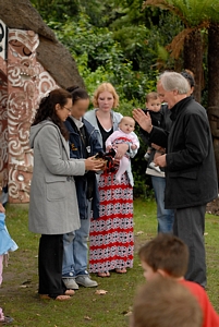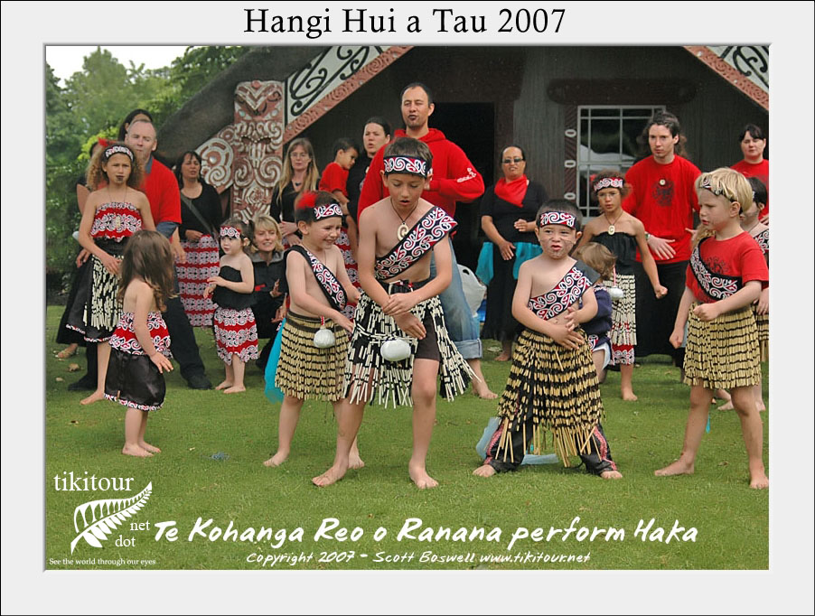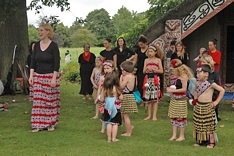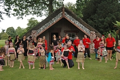 Kohanga tamariki performing for the manuhiri in front of Hinemihi.