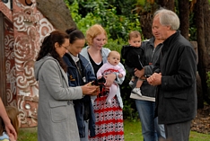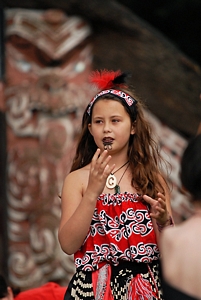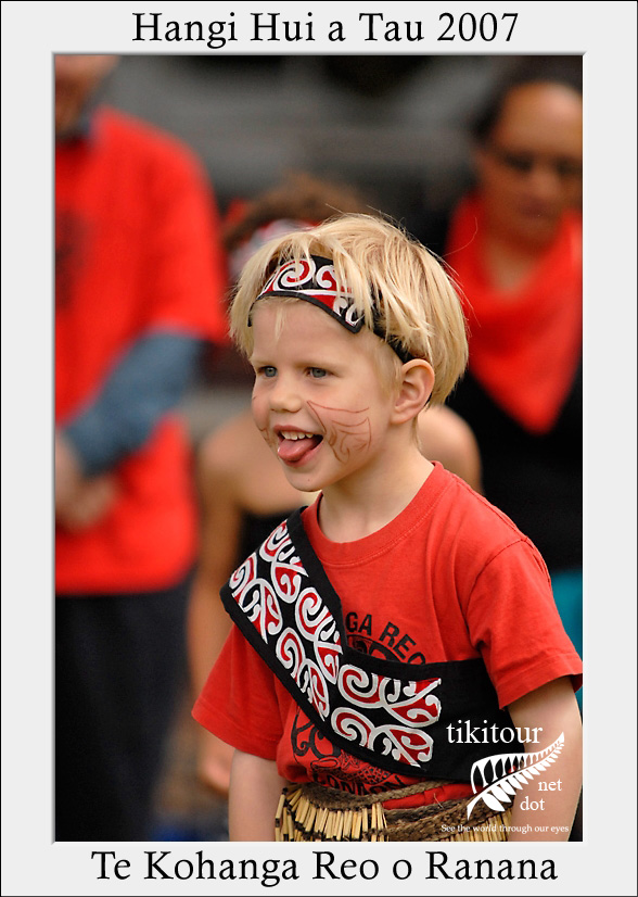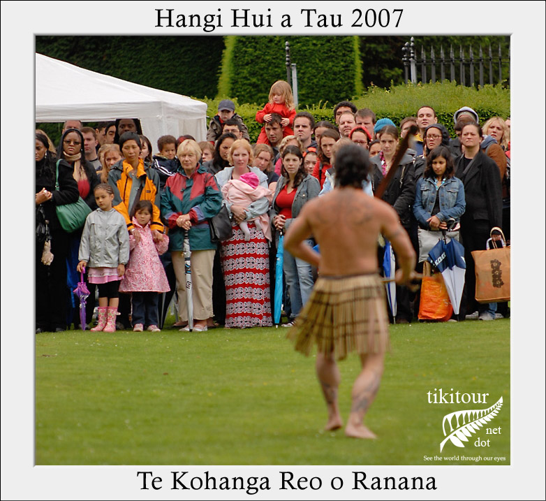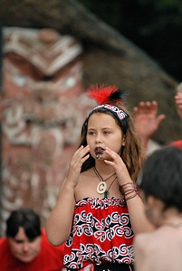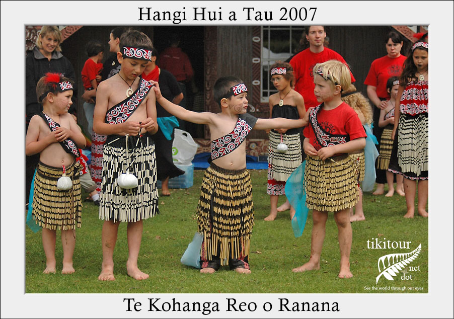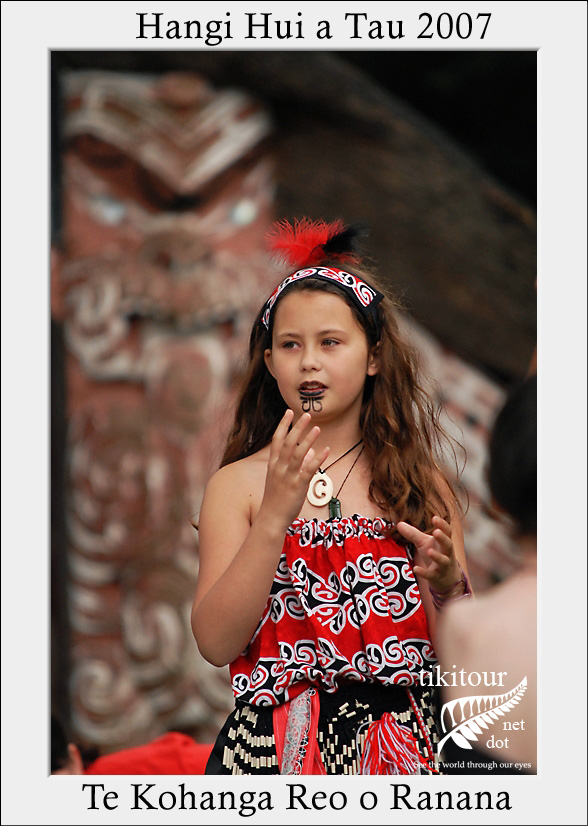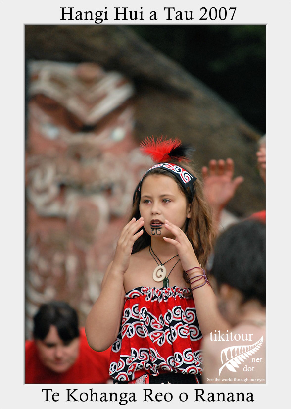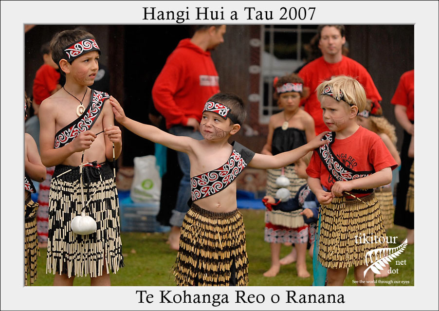 Kohanga tamariki performing for the manuhiri in front of Hinemihi.