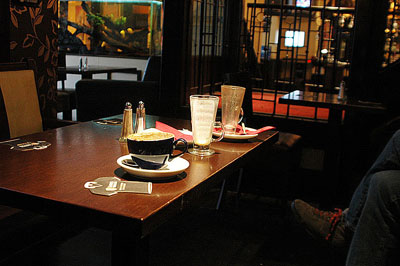 Sign of the times! No longer the hard men of 20 years ago! Yes, those are coffee cups on our table in a pub!