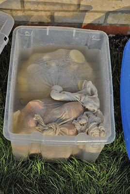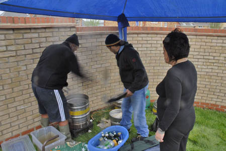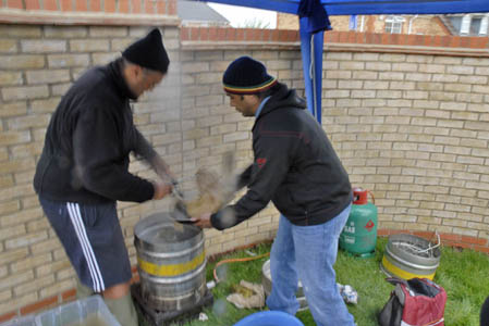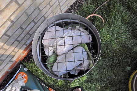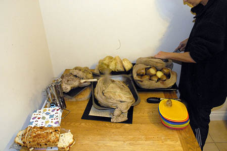 Its like being in Jamie Oliver's back yard :) Layering the food in to the hangi keg. Meat in the lower sections with the veggies higher in the keg. |