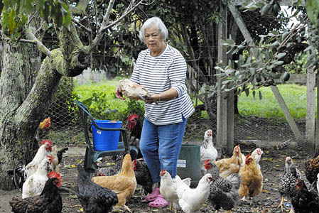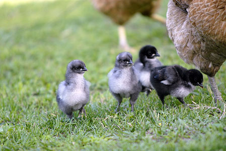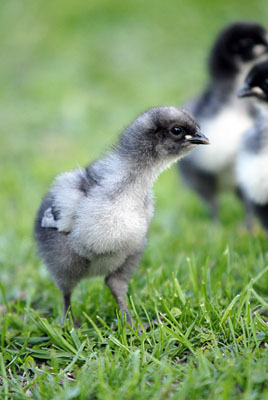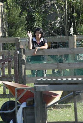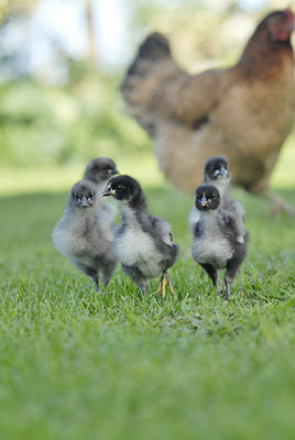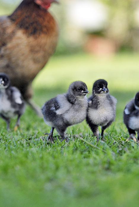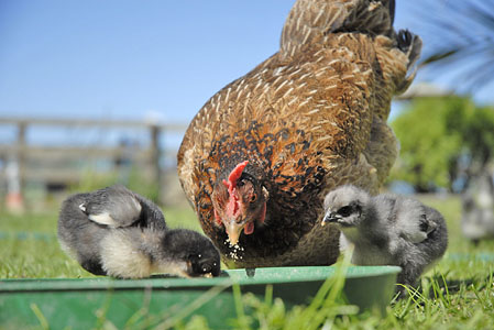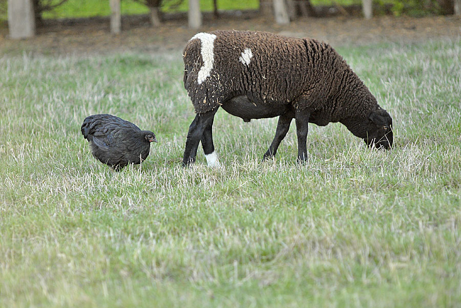 One of the chickens spends its days hanging around with the sheep in the back paddock!