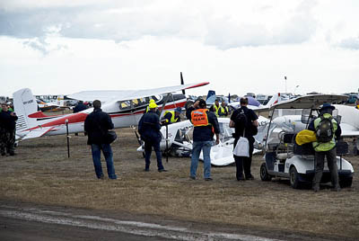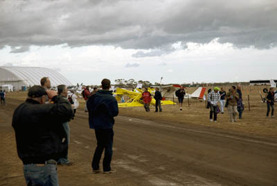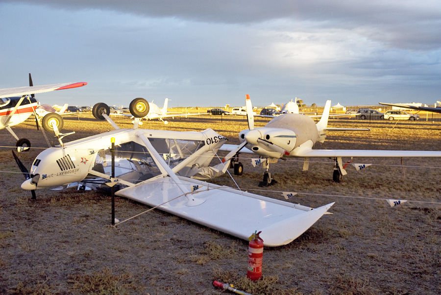 This is the result of 10 minutes of violent winds! Two ultra light aircraft destroyed. Fortunately the micro burst struck after the public day had finished, so the only people around were the volunteers and rescue crews.