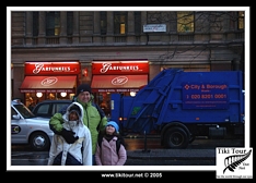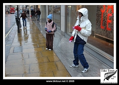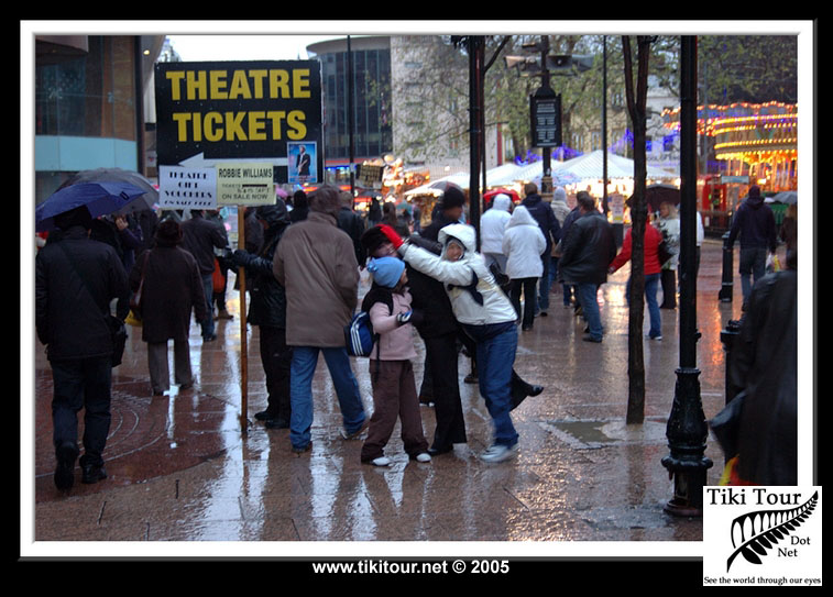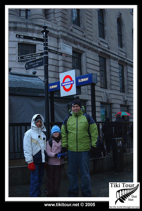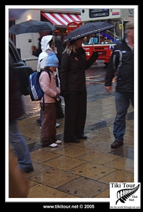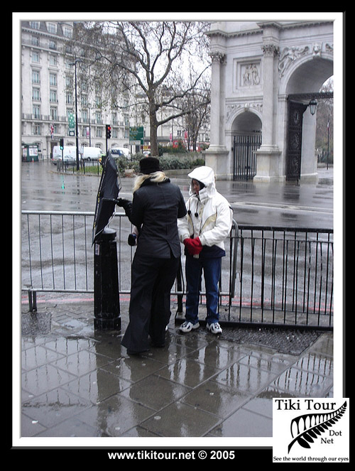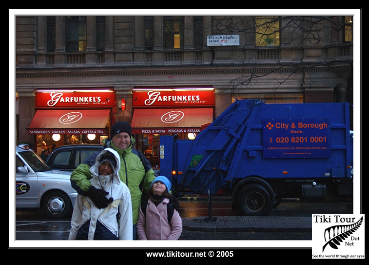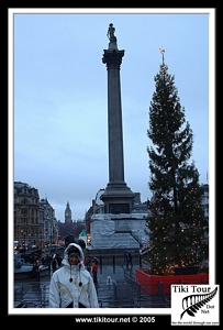 Trafalgar Square, Whetu making good use of her raincoat! |