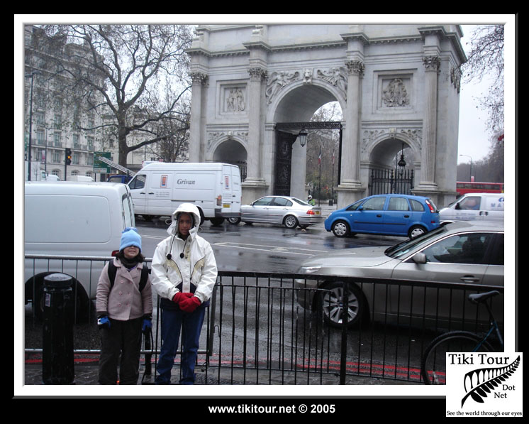 Park Lane. Which is actually just to the right of Marble Arch (behind the girls). |