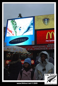 Leicester Square, Eimii, Whetu and Michelle standing next to one of the many advertising boards that can be found in this area! |
