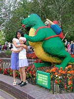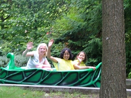 We thought longer summer hours would allow us to see more of the Legoland park on our second visit. However, after spending much of the day waiting in queues for the thrill rides we still raced through the lego mini village about half an hour before closing. The miniature village is what Legoland is really about. There are some amazing constructions with over 64 million lego blocks used in the park. Whetu and Eimi earned their driving licences and Scott managed to trick his mother into riding the dragon coaster, a gentle rollercoaster! The girls thought this was very mischevious.