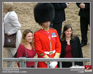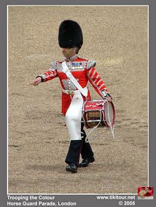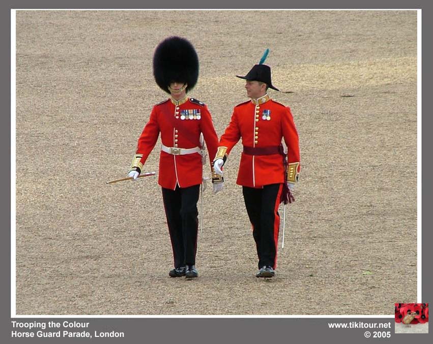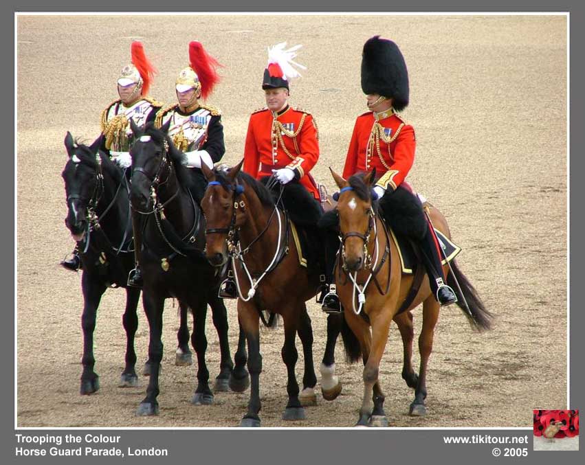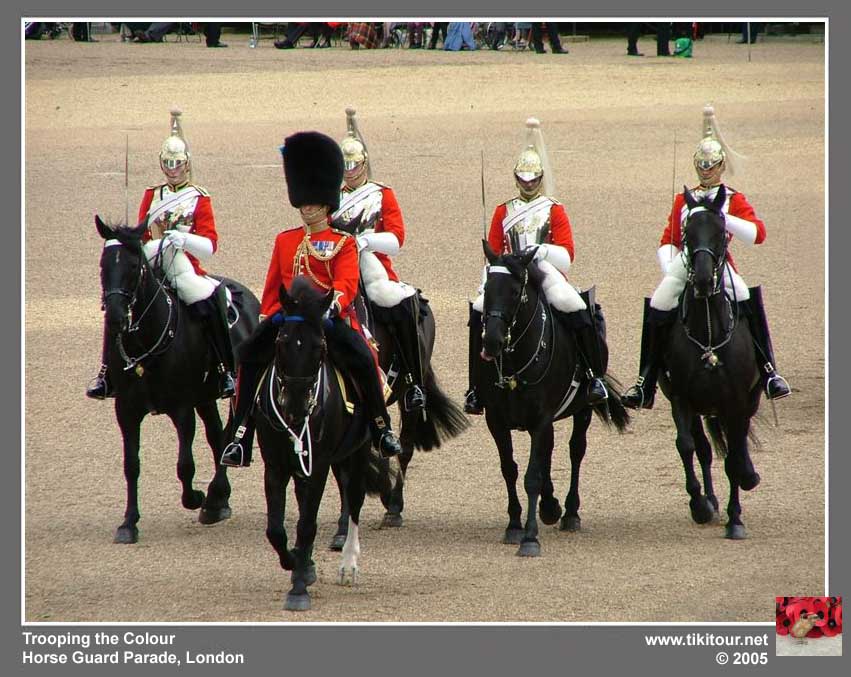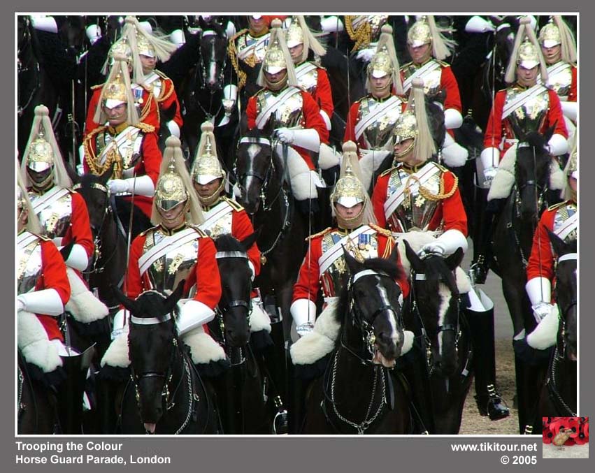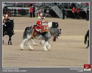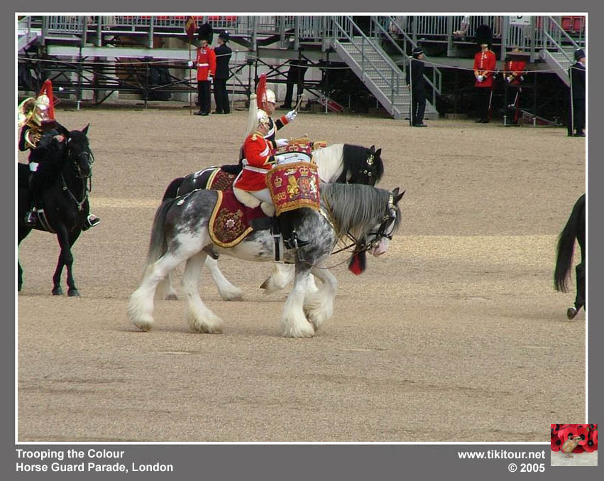 The draft horses Constantine, of the Lifeguards, and Spartacus, of the Blues and Royals, march on to the parade ground with their kettle drums that are over 250 years old and made of solid silver!.